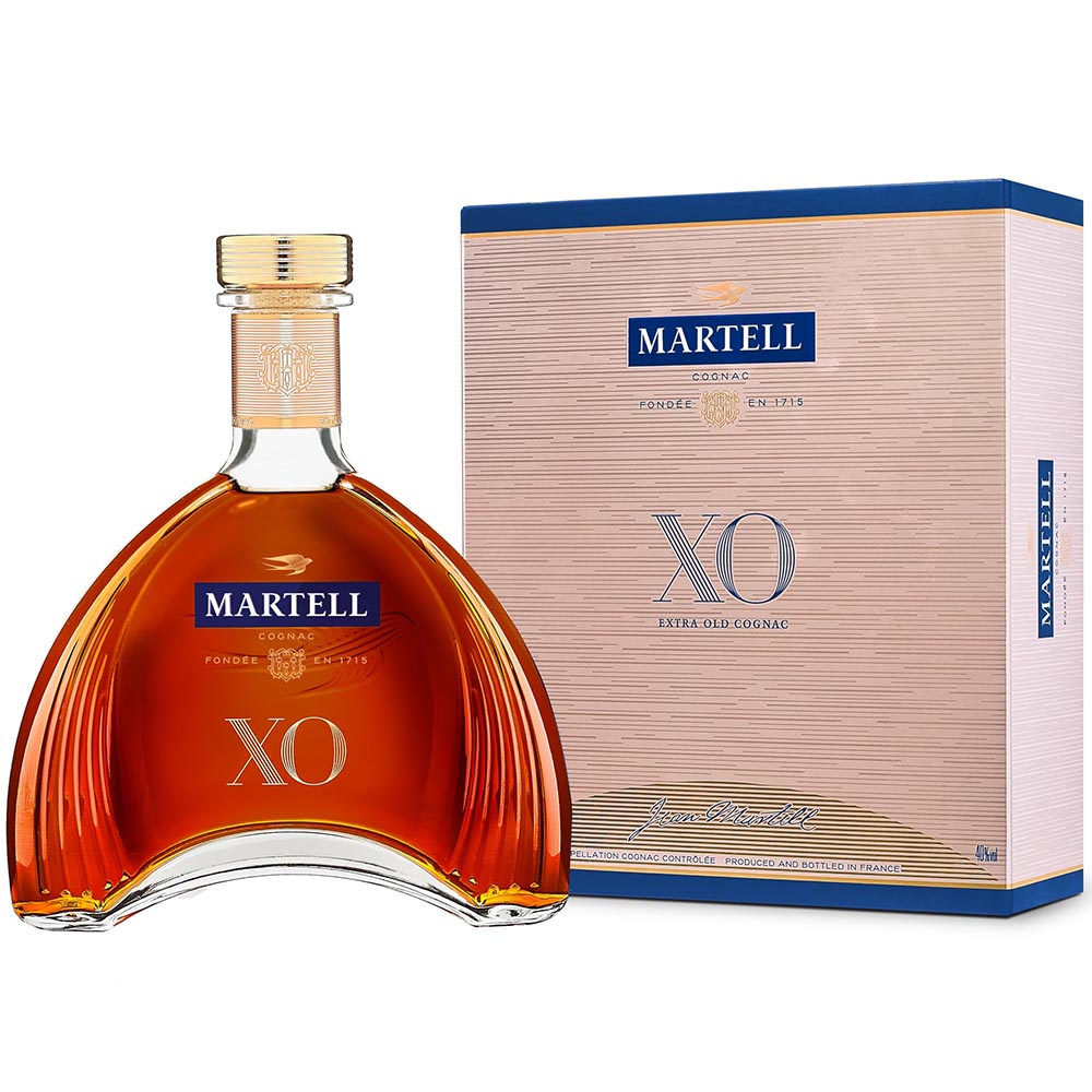 Martell XO es un cognac suave y estructurado que se presenta en una botella emblemática de forma arqueada.