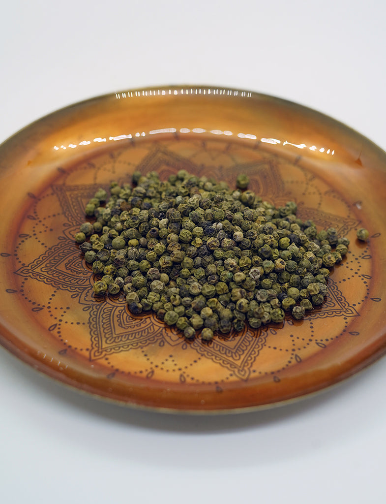 Fruto de la planta Piper Nigrum recolectado entre 1 y 2 meses antes de su maduración, siendo sometido posteriormente a desecación. La pimienta verde son granos totalmente sin madurar. Su sabor es algo suave y frutal, pero con un toque picante. Se puede conservar en salmuera o en vinagre.